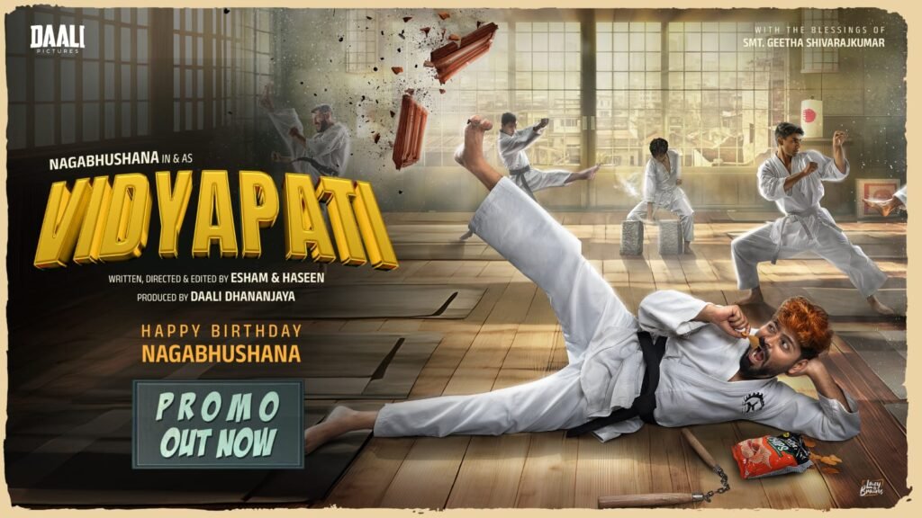 ವಿದ್ಯಾಪತಿಯಾಗಿ ಟಗರು ಪಲ್ಯ ನಾಯಕ ನಾಗಭೂಷಣ್ ಬಣ್ಣ ಹಚ್ಚಿದ್ದಾರೆ. ಅವರ ಹುಟ್ಟುಹಬ್ಬದ ವಿಶೇಷವಾಗಿ ಚಿತ್ರತಂಡ ವಿದ್ಯಾಪತಿ ಚಿತ್ರದ ಪ್ರೋಮೋ ಅನಾವರಣ ಮಾಡಿದೆ. ಜೇಬು ತುಂಬ ಕಾಸಿರೋನು ಕೊಟ್ಯಾಧಿಪತಿ..ನಿಮ್ಮನ್ನೆಲ್ಲ ಹೊಟ್ಟೆತುಂಬ ನಗಿಸುವವನೇ ನಮ್ಮ ‘ವಿದ್ಯಾಪತಿ’ ಅಂತಾ ಹೀರೋನನ್ನು ಪರಿಚಯಿಸಿದೆ. ಕರಾಟೆ ಕಿಂಗ್ ವೇಷ ತೊಟ್ಟಿರುವ ನಾಗಭೂಷಣ್ ಮಾಡುವ ಕಿತಾಪತಿ ತುಣುಕುವೊಂದನ್ನು ಬಿಡುಗಡೆ ಮಾಡಿದೆ. ಕರಾಟೆ ಕಲಿಯುವ ವೇಳೆ ವಿದ್ಯಾಪತಿ ಮಾಡುವ ಯಡವಟ್ಟು ಪ್ರೇಕ್ಷಕರಿಗೆ ಮುಖದ ಮೇಲೆ ಮಂದಹಾಸ ಮೂಡಿಸುತ್ತದೆ.